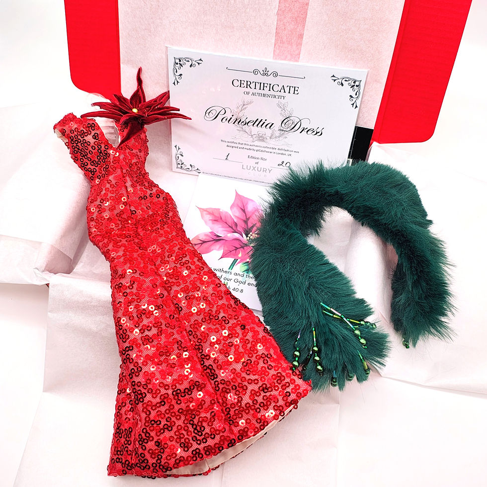 From bloom to stroll - the very first couture story unfolds. Inspired by Amaryllis blooms once prized in Victorian conservatories and Hyde Park’s frosted winter walk, this outfit is more than fashion. It’s a collector’s journey through London elegance, where imagination meets reality in couture. So let us take you to London’s Hyde Park on a crisp December morning… frosted paths, rosy cheeks, and the promise of something rare. As you stroll toward Knightsbridge, scarlet Amaryllis blooms glow through townhouse windows. That same wonder carries into your own reality: when you join the Club and receive your first package, with this couture dress, the bold Amaryllis colours and power‑shouldered silhouette will instantly transport you back to Hyde Park’s frosty charm and Knightsbridge’s glowing windows - imagination made tangible, a London winter captured on your doll shelf. INSIDE YOUR BOX The dress in detail: - Dramatic dress silhouette with precision cuts, structure, and tailoring that command presence. - Signature powerful shoulder sleeves for bold confidence. - Cropped skirt with angular hips - a Balmain‑inspired silhouette. - Accents in striking magenta pink, echoing the Amaryllis bloom. - Weeks of expert hand‑embroidery with sequins and glass beads, showcasing artisanal craftsmanship. - Tiny back zip closure, a discreet detail for perfect fit and finish. - Fully lined interior in soft couture satin, ensuring both structure and elegance from within. - Includes a numbered Certificate of Authenticity, ensuring verified origin and long‑term collector value. Welcome gift: - Exclusive limited edition 2026 gtGdollwear desk calendar. And, as with all our orders, your couture arrives with our signature shopping bag with a very special surprise tucked in a box especially for you, and a miniature bouquet of roses - we simply cannot resist. Worth: Your first box contains a couture dress (£129 RRP) and the limited‑edition 2026 desk calendar (£20 RRP). Together they represent £149 (approx. $200) of collector value - received for just £90 (approx. $120) on the subscription plan. Please note: due to artisanal pattern placement, each dress may vary slightly - making every piece truly unique. Offering: For collectors who prefer to secure this debut couture dress outside the subscription, a handful of pieces are released separately in the shop - available at £129 (approx. $170), while they last.